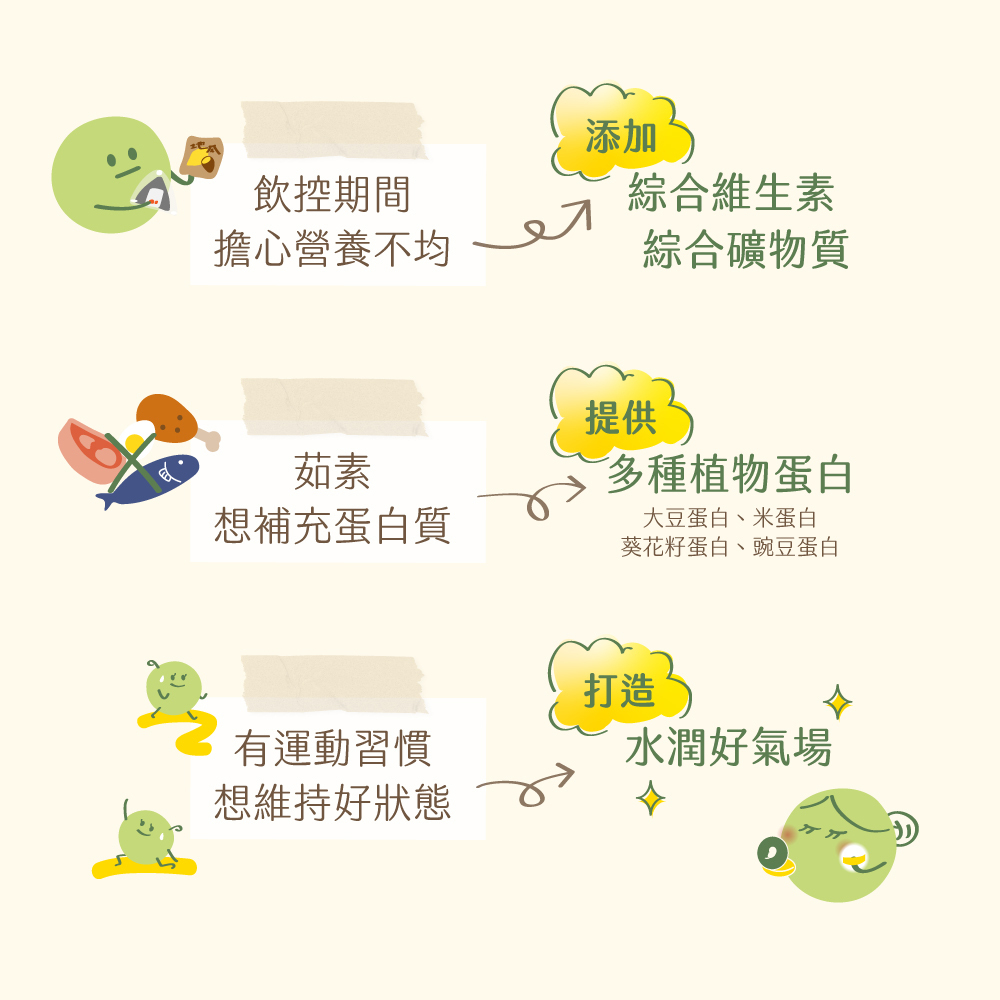 ● 使用 4 種植物蛋白:大豆蛋白、米蛋白、葵花籽蛋白、豌豆蛋白,提供多種植物營養