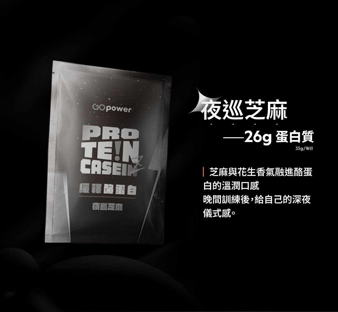 ➤ 夜巡芝麻風味,溫潤芝麻與花生香氣,融入酪蛋白的溫潤口感,晚間訓練後,給自己的深夜儀式感