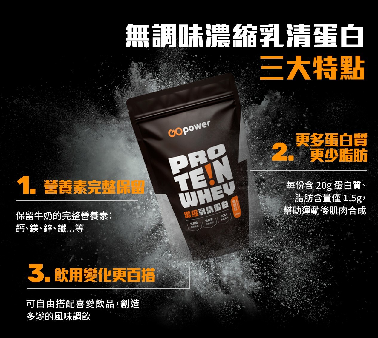 GOpower是臺灣少數使用紐西蘭優質乳清蛋白為基底,針對國人口味所調配的蛋白質營養補充品,具有營養吸收快、奶味較香濃、容易溶解等特色,並且採用ISOHACCP認證廠商進行生產及包裝,安全有保障